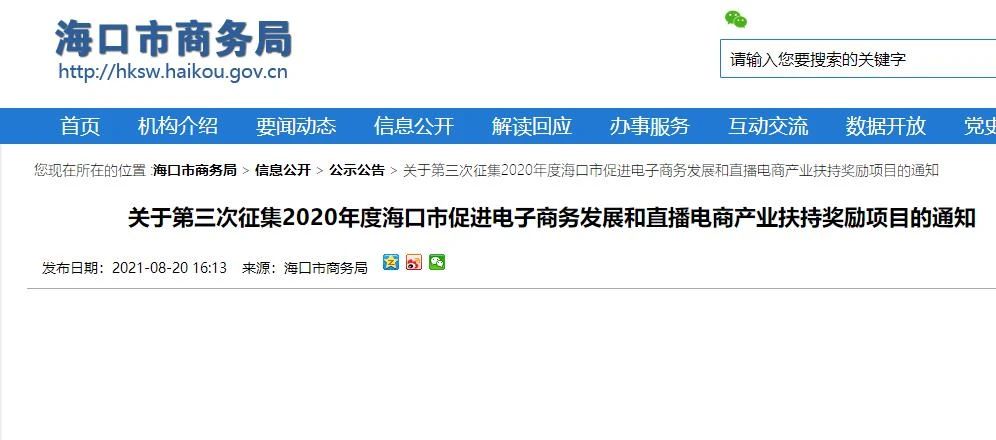8月20日??谑猩虅?wù)局印發(fā)通知,面向社會(huì)公開征集:2020年度??谑写龠M(jìn)電子商務(wù)發(fā)展扶持項(xiàng)目、2020年度??谑兄С职l(fā)展直播電商產(chǎn)業(yè)扶持獎(jiǎng)勵(lì)項(xiàng)目。符合條件的相關(guān)企業(yè)及機(jī)構(gòu)、個(gè)人按照有關(guān)要求申報(bào)。